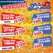 Ganadores de Otra Oportunidad - Miércoles 02 de octubre Los dias lunes, exclusivamente, a los apostadores que jueguen $50 o más de Quiniela o $20 o más de Quiniela Instantánea, el sistema de captación de apuestas, inmediatamente, les emitirá, junto al ticket de apuesta, un cuón rifa para participar del sorteo electrónico de Otra Oportunidad el miércoles inmediato posterior.   Cada miércoles, a ...