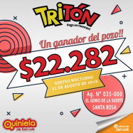 ¡Un ganador del pozo del Tritón en Santa Rosa!   En el sorteo Nocturno Nº 3671, del día sabado 31 de agosto, la suerte visitó a un afortunado ganador que se llevo el pozo acumulado del Tritón. Jugo en la Agencia Nº 035-000, "El Genio de la Suerte" de Santa Rosa y se llevo $22.282.   ¡FELICITACIONES!