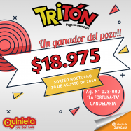 ¡Un ganador del pozo del Tritón en Concaran!   En el sorteo Nocturno Nº 3673, del día martes 03 de septiembre, la suerte visitó a un afortunado ganador que se llevo el pozo acumulado del Tritón. Jugo en la Agencia Nº 067-000, "El Lider" de Concaran y se llevo $40.697.   ¡FELICITACIONES!