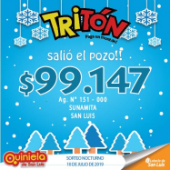 ¡Un ganador del pozo del Tritón en San Luis!   En el sorteo Nocturno Nº 3626, del día miércoles 10 de julio, la suerte visitó a un afortunado ganador que se llevó el pozo acumulado del Tritón con los números 904 y 344. Jugó en la Agencia Nº 151-000, "Sunamita" de San Luis y se llevó $99.147.