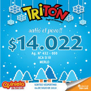 ¡Un ganador del pozo del Tritón en Merlo!   En el sorteo Vespertino Nº 1712, del día jueves 4 de julio, la suerte visitó a un afortunado ganador que se llevó el pozo acumulado del Tritón. Jugó en la Agencia Nº 432-000, "Aca Si III" de Merlo y se llevó $14.022.