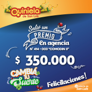 ¡Salió un premio de Quiniela en San Francisco del Monte de Oro! El día Jueves 20 de Marzo, en la Agencia N° 414-003 "Comodin II" de San Francisco del Monte de Oro, salió un premio de Quiniela de $350.000 ¡Felicitaciones al afortunado ganador!