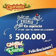 ¡Salió un premio de Quiniela en Santa Rosa del Conlara! El día Jueves 20 de Marzo, en la Agencia N° 035-000 "El genio de la suerte" de Santa Rosa del Conlara, salió un premio de Quiniela de $500.000 ¡Felicitaciones al afortunado ganador!