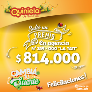 ¡Salió un premio de Quiniela en Santa Rosa de Conlara! El día Martes 25 de Marzo, en la Agencia N° 359-000 "La Tati" de Santa Rosa de Conlara, salió un premio de Quiniela de $814.000 ¡Felicitaciones al afortunado ganador!