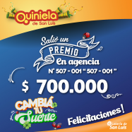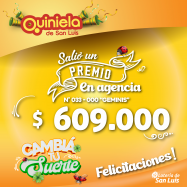 ¡Salió un premio de Quiniela en San Luis! El día Jueves 20 de Marzo, en la Agencia N° 033-000 "Géminis" de San Luis, salió un premio de Quiniela de $609.000 ¡Felicitaciones al afortunado ganador!