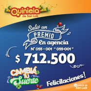 ¡Salió un premio de Quiniela en Luján! El día Martes 25 de Marzo, en la Agencia N° 055-001 de Luján, salió un premio de Quiniela de $712.500 ¡Felicitaciones al afortunado ganador!