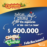 ¡Salió un premio de Quiniela en Villa Mercedes! El día Sábado 22 de Marzo, en la Agencia N° 158-001 "La Taba" de Villa Mercedes, salió un premio de Quiniela de $600.000 ¡Felicitaciones al afortunado ganador!