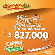 ¡Salió un premio de Quiniela en Villa Mercedes! El día Miércoles 26 de Marzo, en la Agencia N° 135-000 "La Fija" de Villa Mercedes, salió un premio de Quiniela de $827.000 ¡Felicitaciones al afortunado ganador!