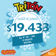 ¡Un ganador del pozo del Tritón en Naschel!   En el sorteo Vespertino Nº 1687, del día miércoles 5 de junio, la suerte visitó a un afortunado ganador que se llevó el pozo acumulado del Tritón con los números 242 y 051. Jugó en la Agencia Nº 481-000, "La Vaquita" de Naschel y se llevó $19.433.