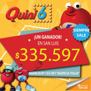 ¡Un ganador del Siempre Sale del Quini 6 en San Luis!   El sorteo Nº 2608 del Quini 6, del día domingo 7 de octubre de 2018, dejó un ganador en la Ciudad de San Luis. El afortunado jugó su cupón en la Agencia Nº 155-001, "Agencia Italia" y se llevó el premio de $335.597.   ¡Felicitaciones!