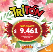 ¡Un ganador del pozo del Tritón en Villa Mercedes!   En el sorteo Nocturno Nº 3397, del día viernes 28 de septiembre, la suerte visitó a un afortunado ganador que se llevó el pozo acumulado del Tritón con los números 619 y 845. Jugó en la Agencia Nº 409-000, "La Coca", de Villa Mercedes y se llevó $20.937.