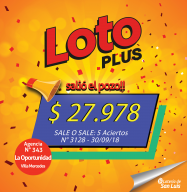 ¡Un ganador del Sale o Sale del Loto Plus con 5 aciertos en Villa Mercedes!   Un apostador de Villa Mercedes, que jugó en la Agencia Nº 343, "La Oportunidad", se llevó el pozo del "Sale o Sale" con 5 aciertos del Loto Plus del sorteo Nº 3128, correspondiente al día domingo 30 de septiembre. Su premio es de $29.978.    ¡¡Felicitaciones!!