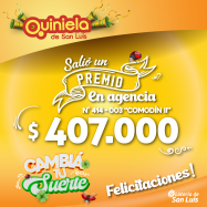 ¡Salió un premio de Quiniela en San Francisco del Monte de Oro! El día Viernes 14 de Marzo, en la Agencia N° 414-003 "Comodín II" de San Francisco del Monte de Oro, salió un premio de Quiniela de $407.000 ¡Felicitaciones al afortunado ganador!