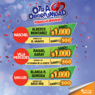 Ganadores del sorteo "Otra Oportunidad" del día 12 de sptiembre de 2018   El sorteo "Otra Oportunidad" consiste en 3 premios de $1000 en efectivo para los apostadores de los tickets sorteados no ganadores y 3 premios de $500 para las agencias que vendieron los mismos tickets sorteados. Los sorteos están divididos en tres zonas (San Luis, Villa Mercedes e interior) y ...