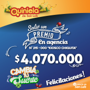 ¡Salió un premio de Quiniela en Villa Mercedes! El día Miércoles 05 de Marzo, en la Agencia N° 215-000 "Kiosco Chiquita" de Villa Mercedes, salió un premio de Quiniela de $4.070.000 ¡Felicitaciones al afortunado ganador!