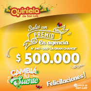 ¡Salió un premio de Quiniela en Villa Mercedes! El día Jueves 06 de Marzo, en la Agencia N° 340-000 "La gran chance" de Villa Mercedes, salió un premio de Quiniela de $500.000 ¡Felicitaciones al afortunado ganador!
