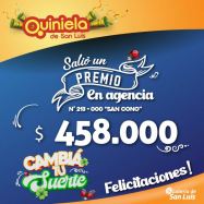¡Salió un premio de Quiniela en Villa Mercedes! El día Sábado 08 de Marzo, en la Agencia N° 213-000 "San Cono" de Villa Mercedes, salió un premio de Quiniela de $458.000 ¡Felicitaciones al afortunado ganador!