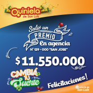 ¡Salió un premio de Quiniela en Quines! El día Viernes 07 de Marzo, en la Agencia N° 129-000 "San José" de Quines, salió un premio de Quiniela de $11.550.000 ¡Felicitaciones al afortunado ganador!