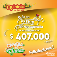 ¡Salió un premio de Quiniela en San Luis! El día Jueves 06 de Marzo, en la Agencia N° 182-000 "San José" de San Luis, salió un premio de Quiniela de $407.000 ¡Felicitaciones al afortunado ganador!