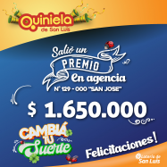 ¡Salió un premio de Quiniela en Quines! El día Viernes 07 de Marzo, en la Agencia N° 129-000 "San José" de Quines, salió un premio de Quiniela de $1.650.000 ¡Felicitaciones al afortunado ganador!
