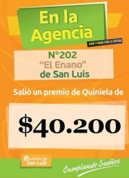 ¡¡El Sábado, en la agencia n° 202 "El Enano" de San Luis, un apostador jugó a la Quiniela y ganó un premio de $ 40.200!! ¡¡Muchas felicidades!!