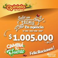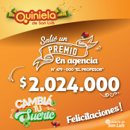 ¡Salió un premio de Quiniela en San Luis! El día Sábado 01 de Marzo, en la Agencia N° 479-000 "El Profesor" de San Luis, salió un premio de Quiniela de $2.024.000 ¡Felicitaciones al afortunado ganador!