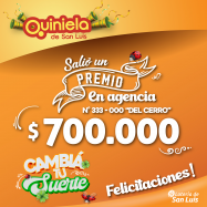 ¡Salió un premio de Quiniela en San Luis! El día Lunes 03 de Marzo, en la Agencia N° 333-000 "Del Cerro" de San Luis, salió un premio de Quiniela de $700.000 ¡Felicitaciones al afortunado ganador!