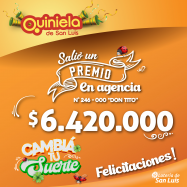 ¡Salió un premio de Quiniela en El Trapiche! El día Sábado 01 de Marzo, en la Agencia N° 246-000 "Don Tito" de El Trapiche, salió un premio de Quiniela de $6.420.000 ¡Felicitaciones al afortunado ganador!