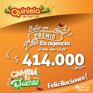 ¡Salió un premio de Quiniela en La Punta! El día Martes 04 de Marzo, en la Agencia N° 900-001 "La 22" de La Punta, salió un premio de Quiniela de $414.000 ¡Felicitaciones al afortunado ganador!