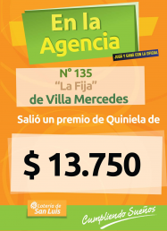 En Villa Mercedes, en la Agencia N° 135 "La Fija" un afortunado apostador recibió un premio de Quiniela de $13.750...¡felicitaciones!