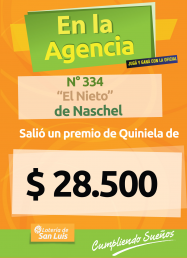 En Naschel, en la Agencia N° 334 "El Nieto" un afortunado apostador recibió un premio de Quiniela de $28.500...¡felicitaciones!
