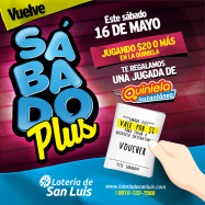 Lotería de San Luis continua con la gran promo sábado Plus, este sábado 16 de Mayo acércate a tu agencia amiga y si realizas una apuesta de $20 o más a la Quiniela Instantánea te regalamos un voucher de $ 1 para que lo puedas canjear por una jugada gratis de Quiniela Instantánea.