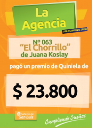 En Juana Koslay, la Agencia N° 063 "El Chorrillo" pagó un premio de $23.800....felicitaciones ¡el juego oficial te paga y te premia!