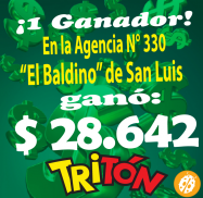 Hubo un ganador del Tritón del sorteo Nocturno. Precisamente en la Agencia N°330 "El Baldino" de San Luis. El premio fue de $28.642...felicitaciones al afortunado ganador...¡el juego oficial te paga y te premia!