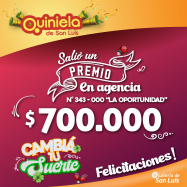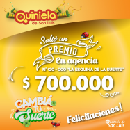 ¡Salió un premio de Quiniela en San Luis! El día Sábado 22 de Febrero, en la Agencia N° 033-000 "Géminis" de San Luis, salió un premio de Quiniela de $700.000 ¡Felicitaciones al afortunado ganador!