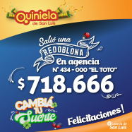 ¡Salió un premio de Redoblona en Quines! El día Jueves 20 de Febrero, en la Agencia N° 434-000 de "El Toto" de Quines, salió un premio de Redoblona de $718.666 ¡Felicitaciones al afortunado ganador!
