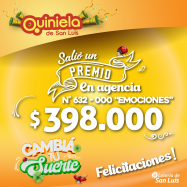 ¡Salió un premio de Quiniela en Villa Mercedes! El día Viernes 21 de Febrero, en la Agencia N° 632-000 "Emociones" de Villa Mercedes, salió un premio de Quiniela de $398.000 ¡Felicitaciones al afortunado ganador!