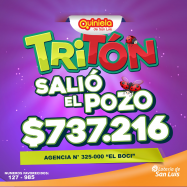¡UN GANADOR DEL TRITÓN EN JUSTO DARACT! En el sorteo "VESPERTINO" del día Viernes 21 de Febrero, hubo un ganador del pozo del Tritón con los números 127 - 985 El afortunado apostador realizó su jugada en la Agencia Nº 325-000 "El Boci" de Justo Daract  y se llevó la suma de $737.216