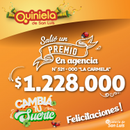 ¡Salió un premio de Quiniela en San Luis! El día Viernes 14 de Febrero, en la Agencia N° 521-000 "La Carmela" de San Luis, salió un premio de Quiniela de $1.228.000 ¡Felicitaciones al afortunado ganador!