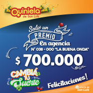 ¡Salió un premio de Quiniela en San Luis! El día Martes 18 de Febrero, en la Agencia N° 038-000 "La Buena Onda" de San Luis, salió un premio de Quiniela de $700.000 ¡Felicitaciones al afortunado ganador!