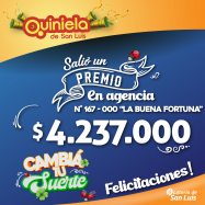 ¡Salió un premio de Quiniela en San Luis! El día Sábado 15 de Febrero, en la Agencia N° 202-001 de San Luis, salió un premio de Quiniela de $1.800.000 ¡Felicitaciones al afortunado ganador!