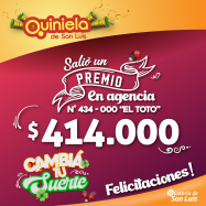 ¡Salió un premio de Quiniela en Quines! El día Lunes 17 de Febrero, en la Agencia N° 434-000 "El Toto" de Quines, salió un premio de Quiniela de $414.000 ¡Felicitaciones al afortunado ganador!