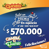 ¡Salió un premio de Quiniela en Merlo! El día Lunes 10 de Febrero, en la Agencia N° 432-000 "Acá sí III" de Merlo, salió un premio de Quiniela de $570.000 ¡Felicitaciones al afortunado ganador!