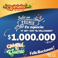 ¡Salió un premio de Quiniela en Villa Mercedes! El día Miércoles12 de Febrero, en la Agencia N° 469-000 "El Millonario" de Villa Mercedes, salió un premio de Quiniela de $1.000.000 ¡Felicitaciones al afortunado ganador!
