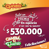 ¡Salió un premio de Quiniela en Naschel! El día Miércoles 12 de Febrero, en la Agencia N° 021-000 "El Vaguito" de Naschel, salió un premio de Quiniela de $530.000 ¡Felicitaciones al afortunado ganador!