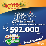 ¡Salió un premio de Quiniela en San Luis! El día Sábado 08 de Febrero, en la Agencia N° 623-000 "Elefante Dorado" de San Luis, salió un premio de Quiniela de $592.000 ¡Felicitaciones al afortunado ganador!