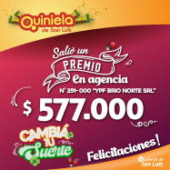¡Salió un premio de Quiniela en Villa Mercedes! El día Lunes 10 de Febrero, en la Agencia N° 251-000 "YPF Brio Norte SRL" de Villa Mercedes, salió un premio de Quiniela de $577.000 ¡Felicitaciones al afortunado ganador!