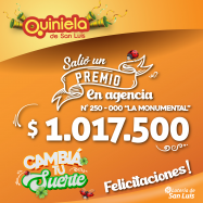 ¡Salió un premio de Quiniela en San Luis! El día Viernes 07 de Febrero, en la Agencia N° 250-000 "La Monumental" de San Luis, salió un premio de Quiniela de $1.017.500 ¡Felicitaciones al afortunado ganador!