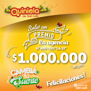 ¡Salió un premio de Quiniela en La Punta! El día Viernes 07 de Febrero, en la Agencia N° 900-001 "La 22" de San Luis, salió un premio de Quiniela de $1.000.000 ¡Felicitaciones al afortunado ganador!