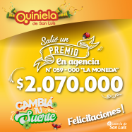 ¡Salió un premio de Quiniela en San Luis! El día Miércoles 05 de Febrero, en la Agencia N° 059-000 "La Moneda" de San Luis, salió un premio de Quiniela de $2.070.000 ¡Felicitaciones al afortunado ganador!